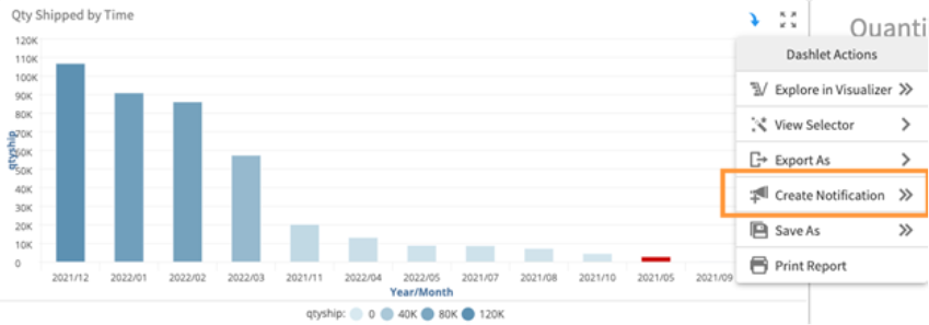 To set up a notification for a dashlet, the dashboard viewer should go to the dashboard and then hover their cursor over the dashlet where they want to create a notification. Once they hover their cursor over the dashlet, they should see a drop-down arrow in the upper right of the dashlet where they can select create notification. All the steps of defining the recipients and setting up the title and the body of the email and the frequency all remain the same.
