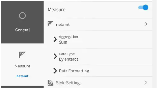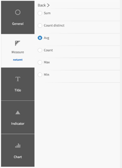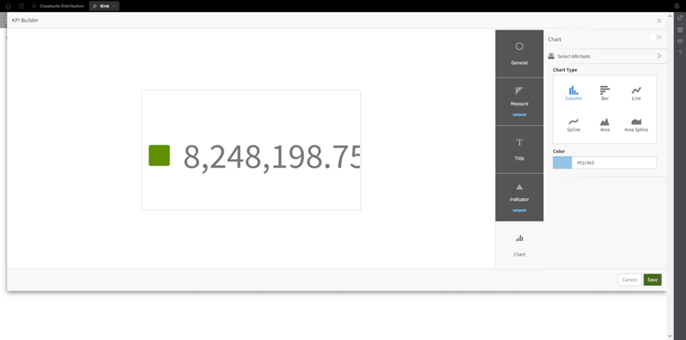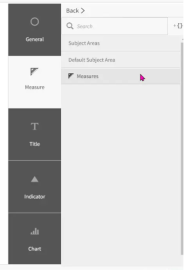 We can choose from the measures presented in the default subject area for the space. For example, if we select the “net amount” measure, we can adjust some additional settings such as the data formatting, styling, and title. We can also add indicators to show whether the value is good or bad.