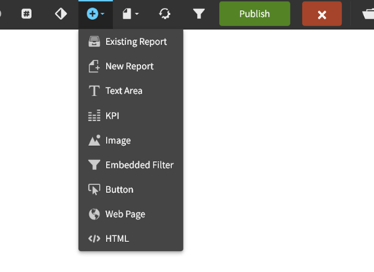 In this tutorial, we will demonstrate how to add web pages to a Birst dashboard. To insert a web page, simply hover your cursor over the plus symbol in the upper ribbon and select “web page” from the dropdown menu.