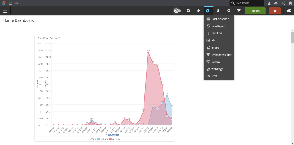 Once you’ve made your changes, click the green save and insert button in the upper right-hand corner. This will save your changes and insert them onto the dashboard. To publish the changes, click the publish button, which is equivalent to save and Birst.