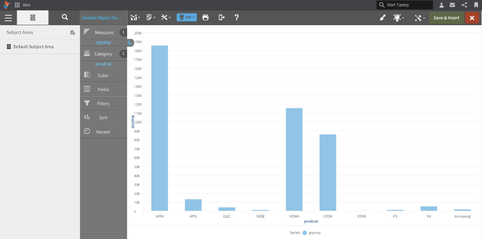 Double-click on “product,” and it will be added to the table. You will notice a green “save and insert” button in the upper right, which you will click to save this change and insert it onto the dashboard.
