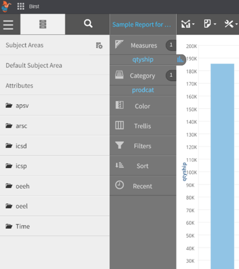 Clicking on “Edit and Visualizer” takes you to the visualizer where you can start making edits to the table. To navigate to the default subject area, you will be presented with three options. These are the options available to add data to the table. You can add measures, attributes, or other expressions.