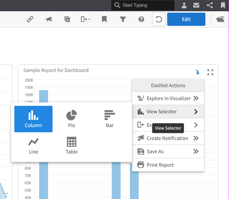 After clicking on the dashlet, you will be presented with an edit button. Clicking on this button will give you four options, and we’re going to focus on the second one, which is edit and visualizer. Clicking on this option will take you to visualizer, where you can start making edits to the table.